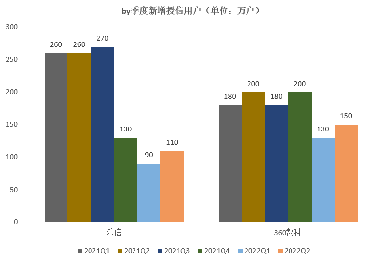 依然对累计授信用户规模、累计授信用户环比增速、新增授信用户量级三个指标进行观察分析。这里信也、小赢、嘉银等未公布授信用户相关数据,仅对乐信、360数科的授信用户进行对比分析。