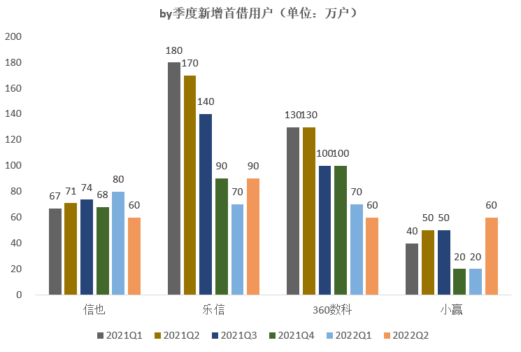 从新增首借用户来看:除信也新增首借户保持相对平稳外,360数科、乐信、小赢均有明显的下滑,其中360数科新增首借户是持续走低,从2021年一季度的130万将至2022年二季度的60万户,新增首借户腰斩;乐信、小赢虽呈现下降趋势,但2022年二季度表现均有所回升,特别是小赢,新增首借户反弹创下新高的60万户。从新增首借户推导各家获客策略方面,乐信与小赢获客策略相似,均呈现先降后扩的走势,信也保持不变,360数科在持续收紧。