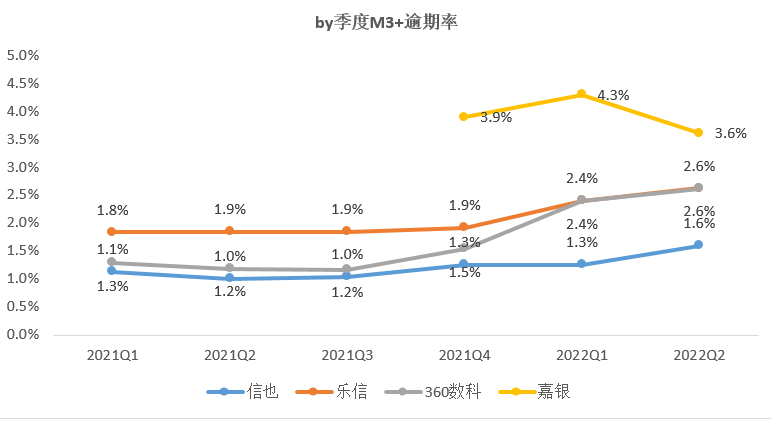 拿行业常用的M3+逾期率作为观察。从数据可以看出,2021年前三季度信也、乐信、360数科的M3+逾期表现相对比较平稳,并无明显的上涨,但从2021Q4开始,上述三家的M3+逾期率开始逐步走高,截至今年二季度末,仍未有放缓的趋势。这和去年下半年开始的国内疫情反复有关,原本平稳的逾期率呈现反弹走高的趋势,后续在国内疫情平稳后,预计逾期率将回落。