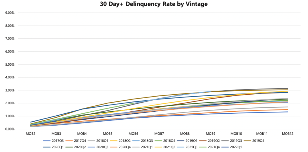 资产质量方面还是观察其逾期及坏账方面数据,为了避免信息的失真,特选定动态池的by balance 逾期率及静态池的by vintage逾期率两个指标进行观察分析。