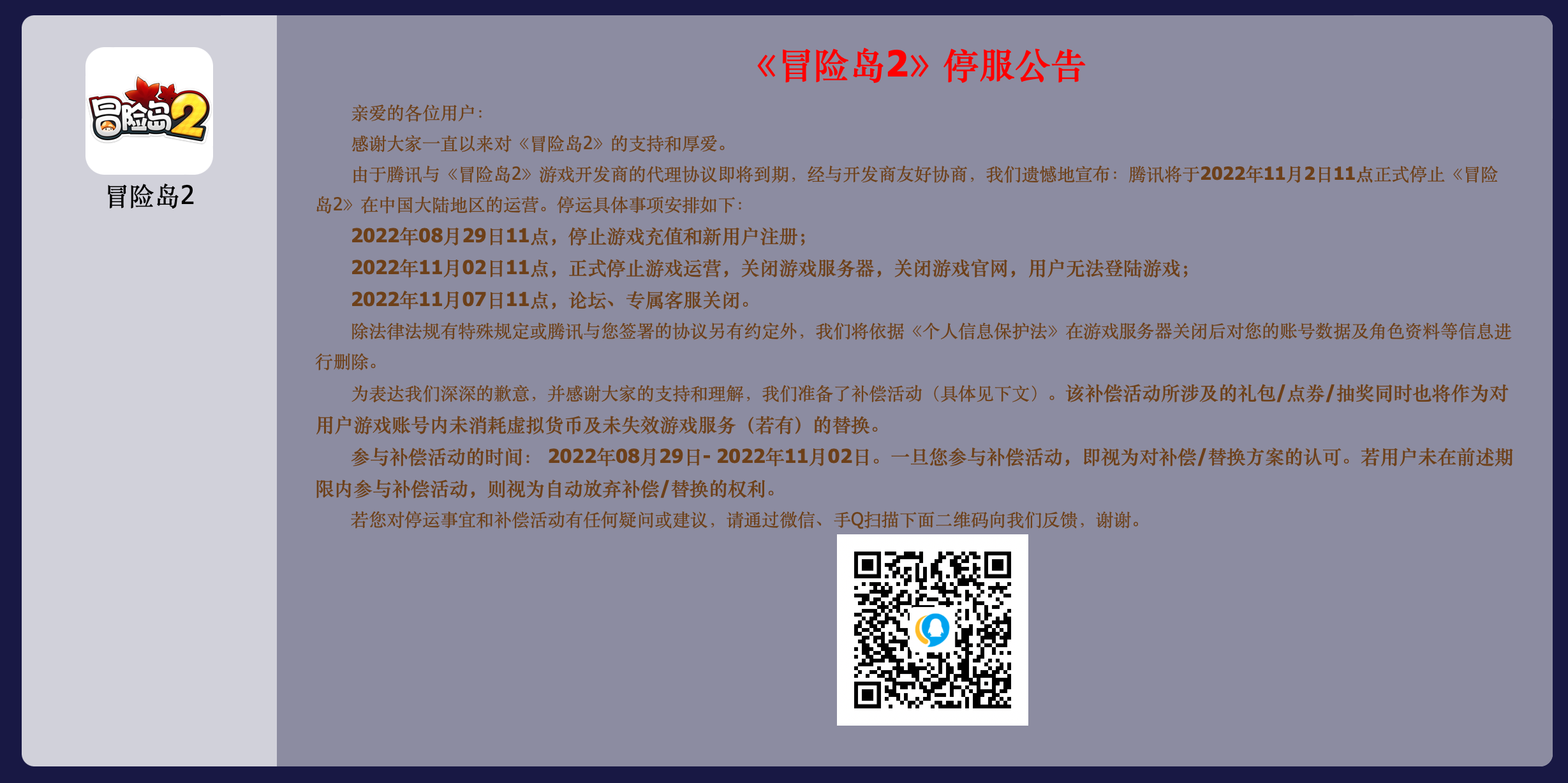 8月29日,《冒险岛2》发布停服公告。由于腾讯与《冒险岛2》游戏开发商的代理协议即将到期,腾讯将于11月2日11点正式停止《冒险岛2》在中国大陆地区的运营。停运具体事项安排如下:
