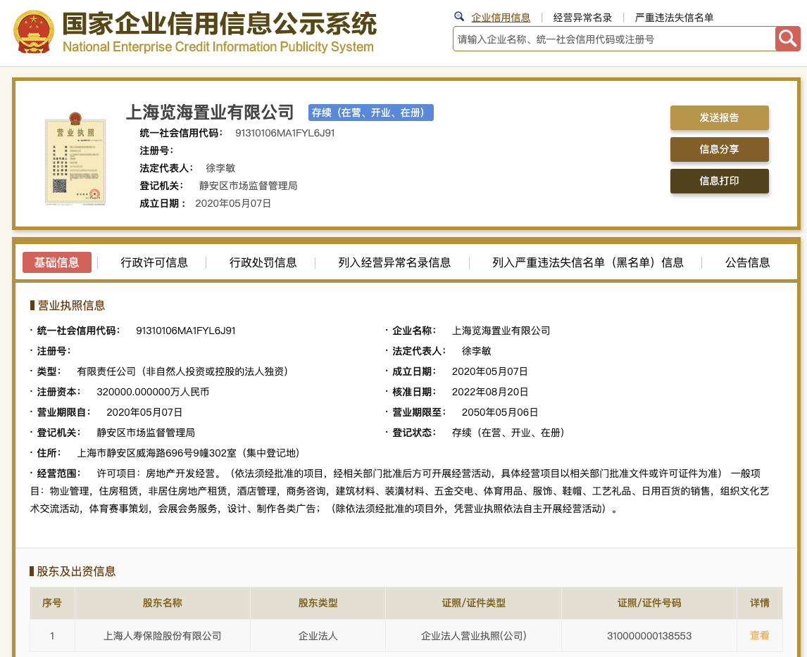 国家企业信用信息公示系统网站显示,8月20日,密春雷父亲密伯元退出上海览海置业有限公司法定代表人、执行董事,由徐李敏接任。同时,该公司股东变更为上海人寿保险股份有限公司,览海控股(集团)有限公司与上海览佑企业管理合伙企业(有限合伙)退出股东行列。