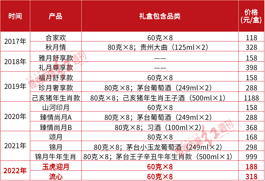 自贵州茅台酒股份有限公司(上市公司)2016年投资兴建至今,茅台国际大酒店每年中秋节之前都会推出不同的月饼,并销售火爆(见附表),今年同样如此。茅台国际大酒店今年中秋节推出的月饼分为流心月饼和玉虎迎月两款,规格均为60克/粒×8,售价分别为318元/盒和188元/盒(见图1),共计约10万盒。