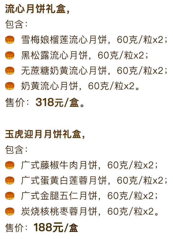 粤海喜来登酒店也是如此。据粤海喜来登酒店官方介绍,公司今年中秋共推出了喜月、皓月、雅月、迎月和珍月5款月饼,分别报价238元/盒、258元/盒、268元/盒、268元/盒和288元/盒,但截至目前,仅有喜月和珍月没有存货。
