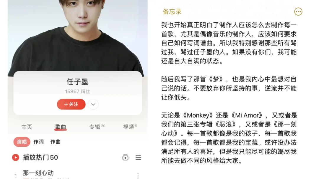 不过,即便内地偶像市场大环境如此,也还是有在为偶像音乐而搜罗制作人的经纪公司。比如哇唧唧哇娱乐就曾在2018年签有唯一一位偶像音乐制作人sususu,成为男团R1SE的专属制作人;也有像坤音娱乐这般,签约任子墨、肖潇、任飞三位专属制作人,放权与旗下男团ONER创作,交出了一份偶像组合与制作人搭配的不错成果。在任子墨的自述中,其是在近百首歌曲中打磨到可以代入成员视角写出歌曲,也逐渐认可自己所从成就的偶像音乐作品,同样可以“影响华语乐坛”。
