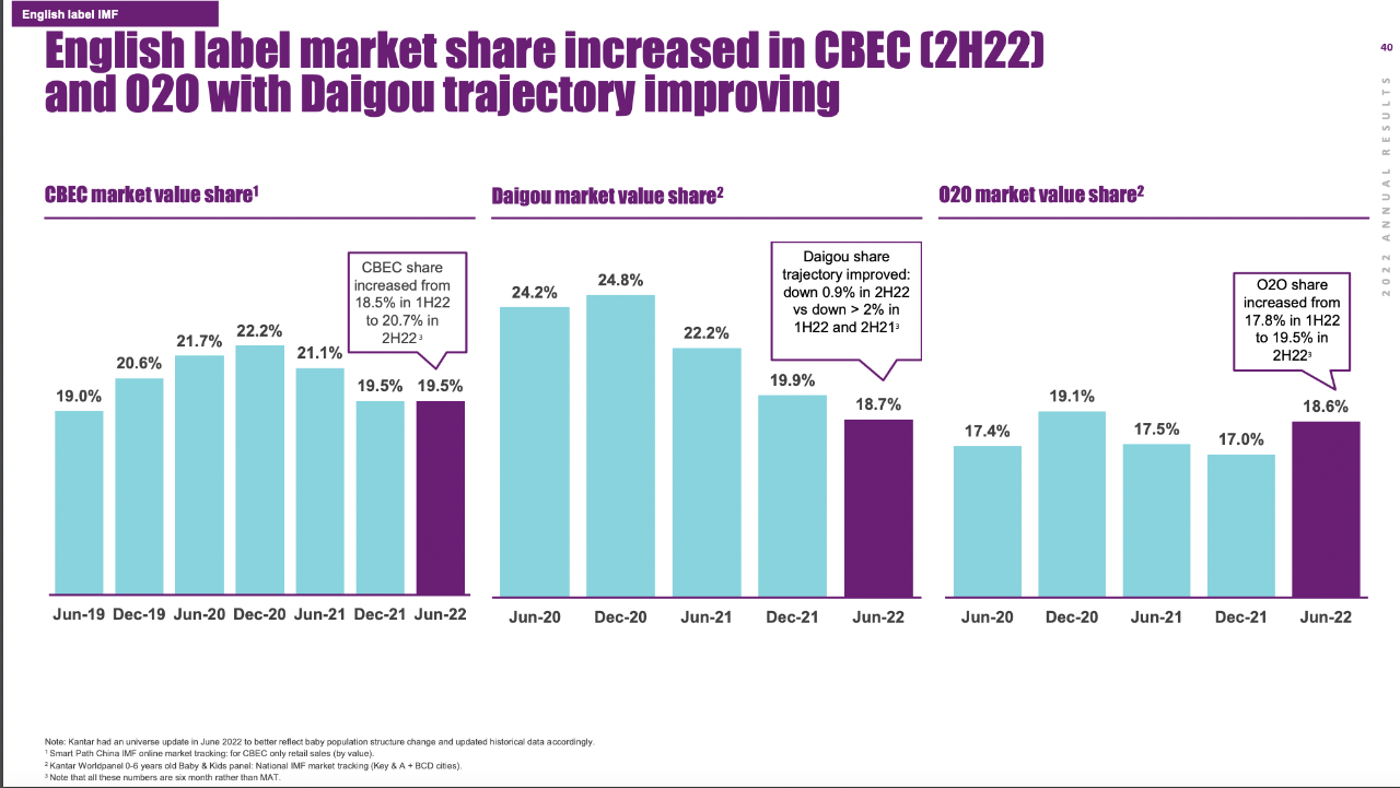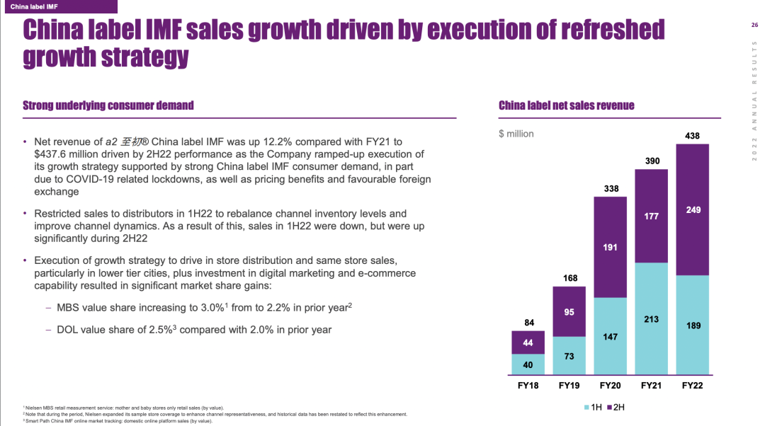 “正如预期,在今年上半年的主要促销活动期间,英标产品销售较去年略有下滑,但下半年已随着跨境电商和代购渠道的定价提高而恢复。”该公司称,根据Smart Path数据,截至2022年6月底,a2在跨境电商的市场价值份额为19.5%,下半年进一步回升至20.7%。2021年6月,该份额为21.1%。