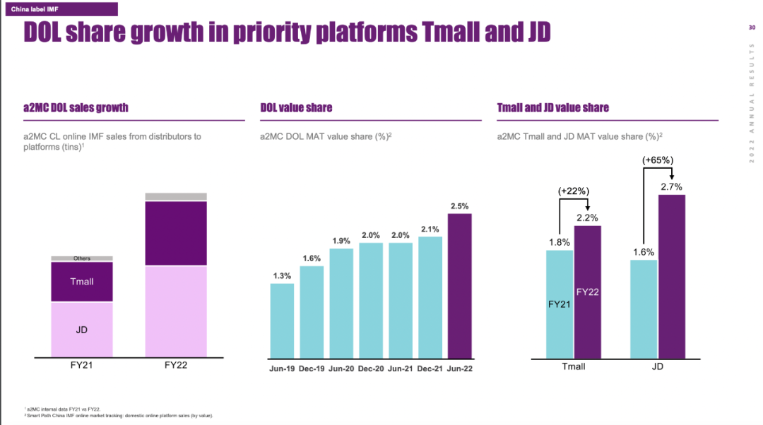 在线上渠道,根据Smart Path数据,截至2022年6月底,a2在该渠道的市场价值份额增加到2.5%,而2021年6月底为2.0%。具体来看,a2在京东和天猫两大平台的份额均有所上升。其中,天猫份额为2.2%,同比上升0.4个百分点。京东份额为2.7%,同比增长1.1个百分点。