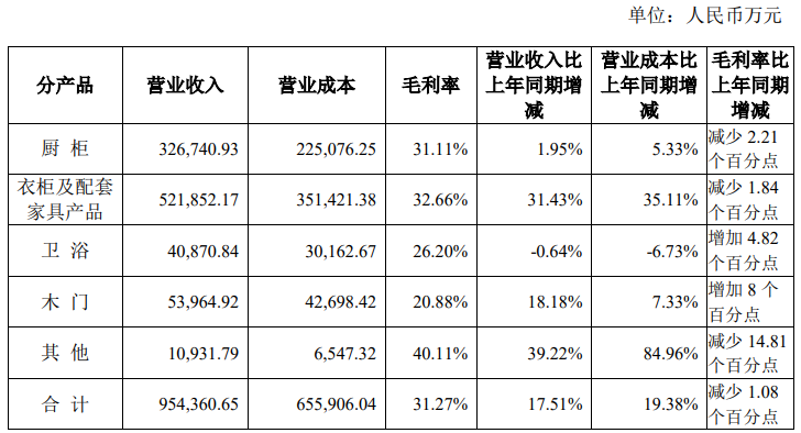 欧派家居早年从橱柜业务起家,后逐渐延伸至衣柜、卫浴、木门等。其中,衣柜、橱柜为公司的主要业务来源。经营数据显示,今年上半年公司橱柜、衣柜业务分别实现营业收入32.67亿元、52.19亿元。