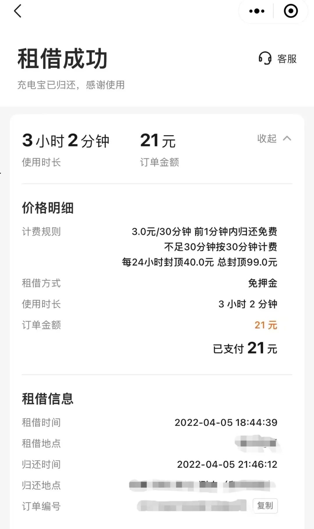 太迟了,已经超时。使用时长3小时2分钟,订单金额21元,吴瑞被这份昂贵的账单吓了一跳,她找出了近两年来充电宝订单记录,发现2020年充一小时只要3元,2022年涨到了一小时4元,在北京部分地段,充一小时甚至要6元。“没想到充一次手机花20块钱”,吴瑞后悔还得太晚,跑得不够快。