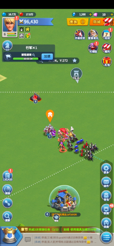 玩家初入游戏主要接触三消玩法,直到城门迷雾解锁之后才会出现SLG内容。一开始的SLG内容也没有高强度的PVP,而是以野外任务、PVE与公会互助内容为主。