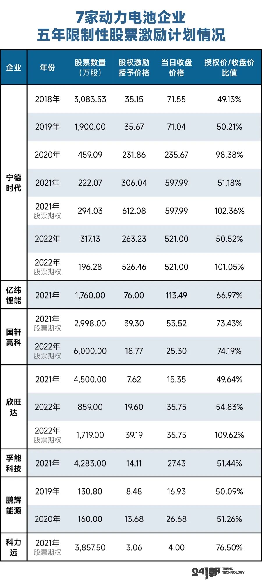 2022年7月21日晚,宁德时代又发布了2022年股票期权与限制性股票激励计划。该激励计划的授予价格为263.23元/股,而当日上市公司收盘价为521.00元,授予价格为收盘价格的50.52%;
