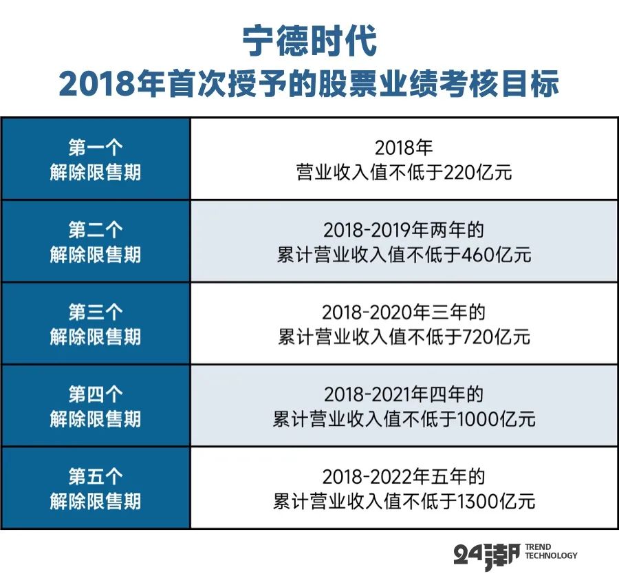 宁德时代最早于2018年7月9日发布了2018年限制性股票激励计划,最终确定的授予价格为35.15元/股,而当日上市公司收盘价为71.55元,授予价格为收盘价格的49.13%。解除限售业绩考核目标如下表所示(核心骨干员工的业绩考核目标则仅为表格前两期,下同):