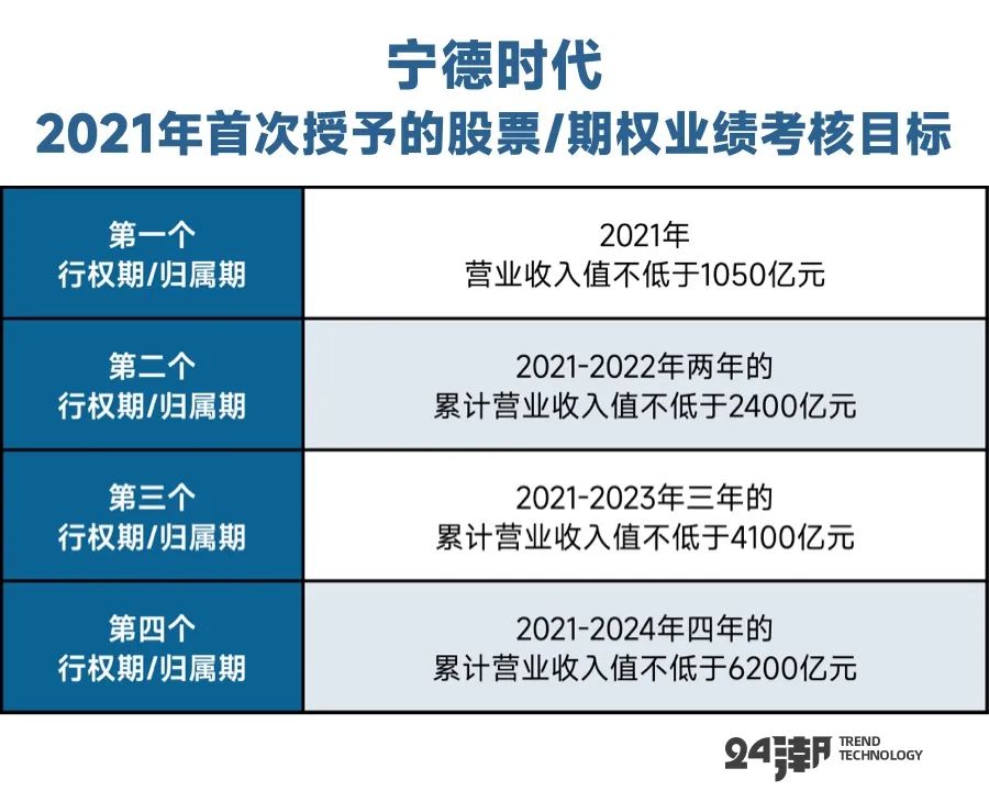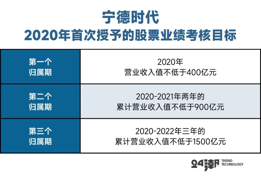 宁德时代又于202年10月13日发布2020年限制性股票激励计划,最终确定的授予价格为231.86元/股,而当日上市公司收盘价为235.67元,授予价格为收盘价格的98.38%。解除限售业绩考核目标如下表所示: