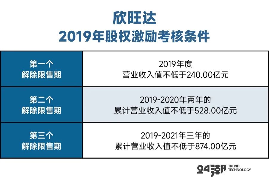 时隔一年,2019年7月2日宁德时代又发布了2019年限制性股票激励计划,最终确定的授予价格为35.67元/股,而当日上市公司收盘价为71.04元,授予价格为收盘价格的50.21%。解除限售业绩考核目标如下表所示:
