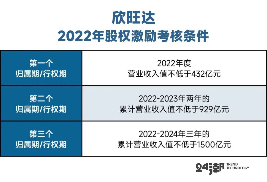 此后,欣旺达又于2022年1月20日晚发布了2022年限制性股票与股票期权激励计划。该激励计划的授予价格为19.60元/股,而当日上市公司收盘价为35.75元,授予价格为收盘价格的54.83%。行权价格最终确定为39.19元/股,行权价格为收盘价格的109.62%。业绩考核目标如下: