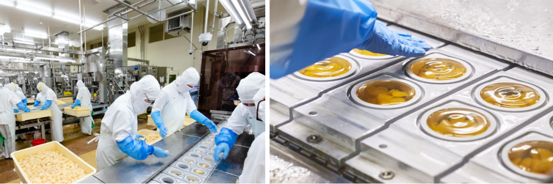 此外,为了最大程度保留当季水果的新鲜口味,采摘后的水果会先在合作农场当地的罐头工厂进行罐装处理,随后送至tarami日本工厂进行后续加工。尽管水果果冻的生产流程早已工业化,但tarami日本工厂从原料的验收、分拣到果冻杯中的填充,均由经验丰富且操作熟练的工作人员负责,严格控制水果的形状、大小、颜色、质地等。