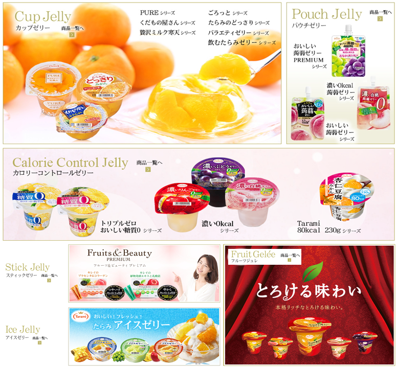 在tarami诞生之前,日本既会食用以寒天为原料的茶果子、粗点心、寒天水果糖等甜品,也有人气的以明胶为原料的自制果冻粉产品“カップゼリーの素”,还诞生了日本特有的夏季清凉人气甜品咖啡果冻,甚至学校的校餐里,也会提供水果果冻作为小甜品。