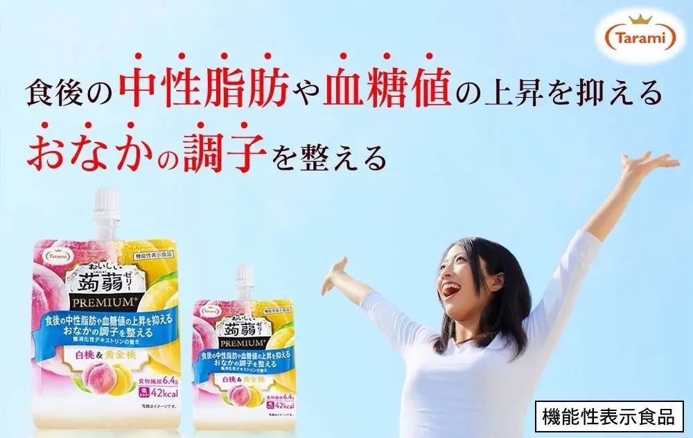 针对一些细分人群的特殊保健需求,tarami还开发了一系列功能性水果果冻。2019年tarami推出旗下第一款具有功能声称的食品“おいしい蒟蒻ゼリー PREMIUM+(プラス)”。以抗性糊精这种食物纤维作为功能性成分,抑制餐后甘油三酯和血糖升高,调节肠胃状况。