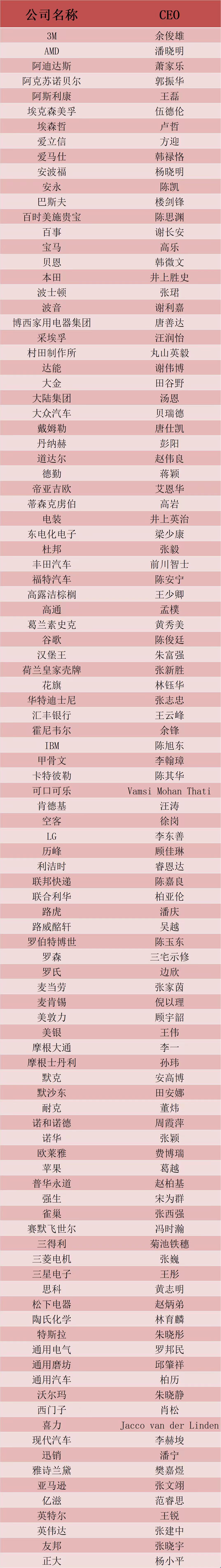 界面新闻2022年度跨国公司中国区CEO入围名单(入围104,按公司名称首字母拼音排序):