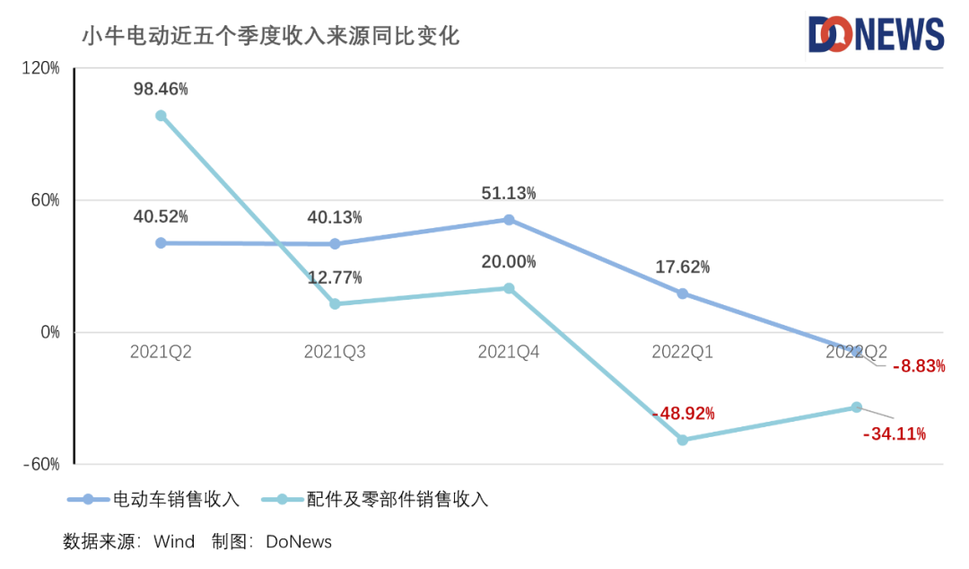 对此,小牛电动只是将其归咎于疫情,财报中表示:“销量的下降主要是由于上海、北京和其他一线城市的新冠病毒封锁,导致了线下零售流量的下降及物流发货受到限制的缘故,这些封锁区域的营收占比国内总销售额的35%-55%。”从小牛电动的收入来源变化来看,受疫情影响最重的2022Q1,来自电动车销售的收入的确环比大幅缩水至5.23亿,同比增长仅为17.62%,不过2022Q2表现更差,同比下跌了8.83%。