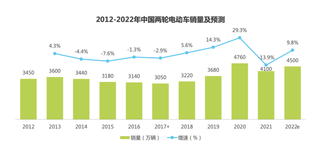两轮电动车主要是用来满足“中短程”出行需求的工具,具有成本低,灵活性高等特点,成为不少居民首选的出行方式之一。艾瑞咨询数据显示,自2018年开始,两轮电动车的年销量就在不断上升,预计到2022年时,销量将达到4500万辆,同比增速达到9.7%。