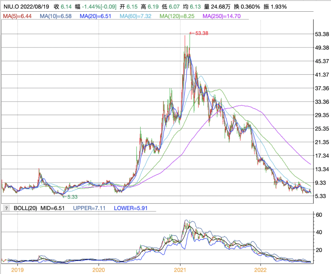 受业绩表现影响,小牛电动的股价不断下行。截止8月19日,股价降幅已达到13.84%。2018年,小牛电动在美股纳斯达克成功上市,此后股价一路上涨,并在2021年2月16日时,达到53.38美元的高点,但一年多之后,其市值已蒸发了近9成。