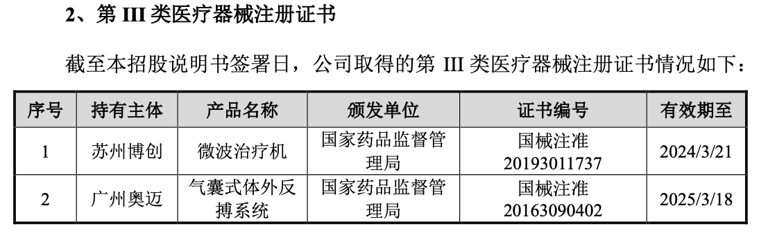 谈及为何收购,则是冲着两家标的公司的第III类医疗器械注册证书。招股书显示,“广州奥迈已取得气囊式体外反搏系统的第III类医疗器械注册证书”和“一体化体外反搏治疗装置”等专利,在体外反搏产品市场具备一定竞争力;苏州博创已取得微波治疗机的第III类医疗器械注册证书,并在产后康复等领域具有一定的研发能力。