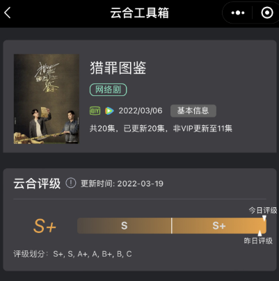 最终,《猎罪图鉴》在今年年初播出,并成为该季度的小黑马。光是“到底有没有第二季”这个话题,就在抖音、微博多次登上热搜。在云合数据的评级里,这部平台评级在A级左右的剧,做出了S+级剧的热度。