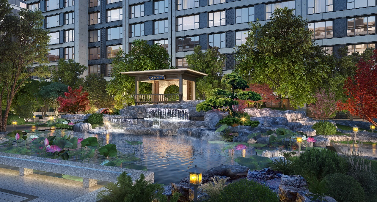 在园林设计上,项目以天坛文脉为依托,以历史名画《乾隆南巡图》为蓝本,汲姑苏名园、江宁乾坤、锦绣西湖等江南园林元素,呈现出中华名园典藏山水的视觉效果。