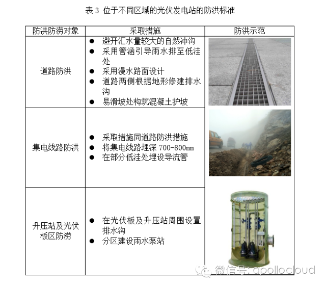 四、可以采取的防洪防涝措施对于光伏电站的防洪防涝,主要以预防为主,防治结合。具体而言,可以从道路防洪、集电线路防洪和升压站及光伏板区防涝三方面着手,具体措施如表3所示: