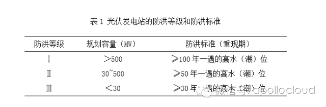 三、光伏电站设计中的防洪要求光伏电站,特别是集中式的中、大型光伏电站,在设计过程中必须充分考虑站址及其周围区域的工程地质地貌情况,做好相应的防洪设计,以避免或减轻洪涝灾害发生时可能造成的损失。根据《光伏发电站设计规范》(GB 50797-2012)对光伏电站防洪设计的要求,按不同规划容量,光伏发电站的防洪等级和防洪标准应符合表1的规定。对于站内地面低于表中所述高水位的区域,应有防洪措施。防排洪措施宜在首期工程中按规划容量统一规划,分期实施。