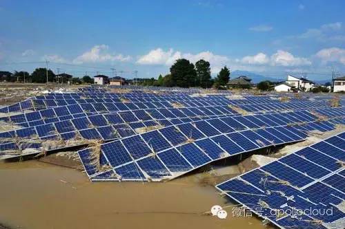 无独有偶,2015年9月,日本茨城县遭遇创纪录的连续暴雨,发生了河水漫过堤坝的“倒灌”灾害,百万太阳能阵列被洪水淹没(如图2)。