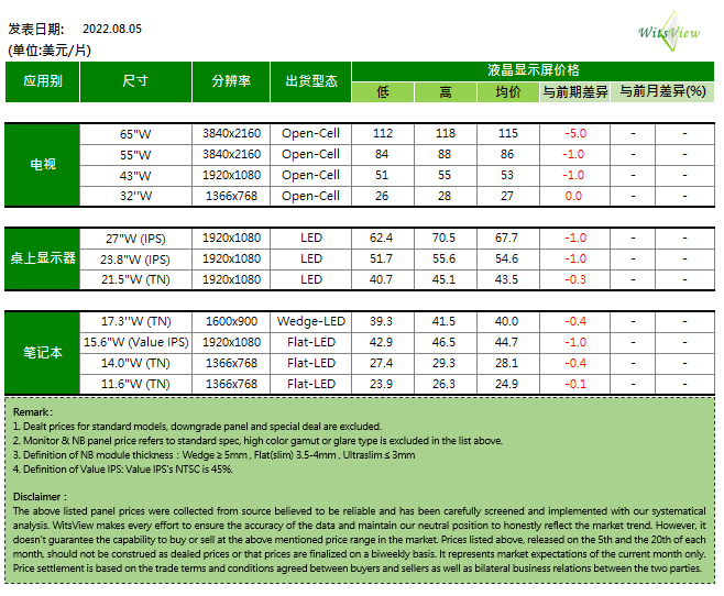 进入8月,除32吋电视面板外,其他面板价格均呈现下降状态,不过除65吋电视面板外,其他面板下降幅度均在1美元以内。