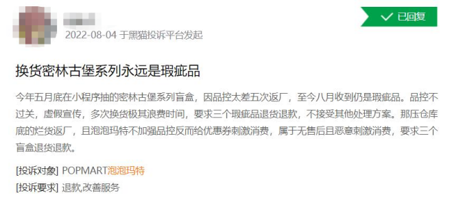 今年8月,有消费者在黑猫投诉上反映,他去年五月在泡泡玛特小程序上抽到的密林古堡系列盲盒,因品控太差五次返厂,但今年8月收到的仍是瑕疵品。该消费者质疑泡泡玛特品控不过关,虚假宣传,多次换货浪费时间,且在售后不到位的情况下,还发放优惠券恶意刺激消费。他要求将瑕疵品退货退款,但该问题至今仍未解决。