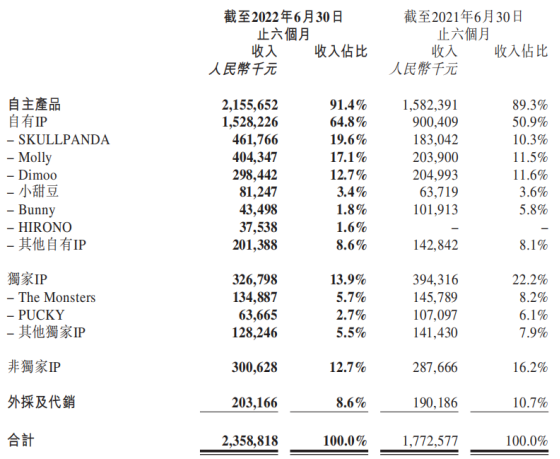 财报数据显示,2022年上半年,收入排名占比前三的IP分别是SKULLPANDA、Molly和Dimoo,分别实现收入4.62亿元、4.04亿元和2.98亿元,分别同比增长152.3%、98.3%和45.6%。这是SKULLPANDA首次超过Molly,成为泡泡玛特收入贡献最大的自有IP。