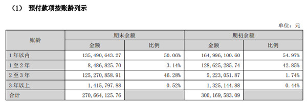 预付款项中,账龄较长部分的比例正在提高,其中,账龄在“2至3年”的部分达1.25亿元,占46.28%,而期初该部分占比仅1.74%。