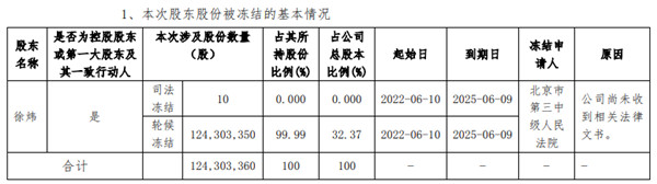 另据8月13日公告,*ST腾信通过公开信息查询获知,其实际控制人徐炜所持有公司的股票全部被冻结及轮候冻结。