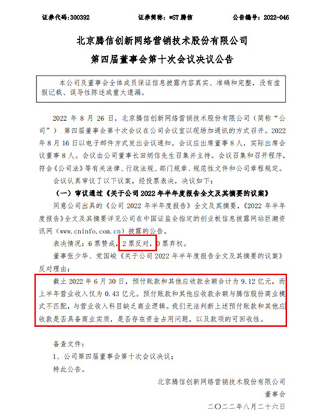 两名董事对半年报议案投了反对票,这在*ST腾信(300392.SZ,原简称“腾信股份”)历次披露的定期报告中已经不是第一次。