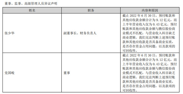 和2022年半年报同时披露的还有*ST腾信的《董事对公司定期报告有异议的说明》,董事会召开会议审议关于《关于公司2022年半年度报告全文及其摘要的议案》时,董事张少华、党国峻对该议案投反对票,反对的理由为: