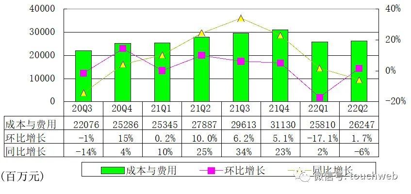 百度2022年第二季度成本与费用为262.47亿元,较上年同期的278.87亿元下降6%。