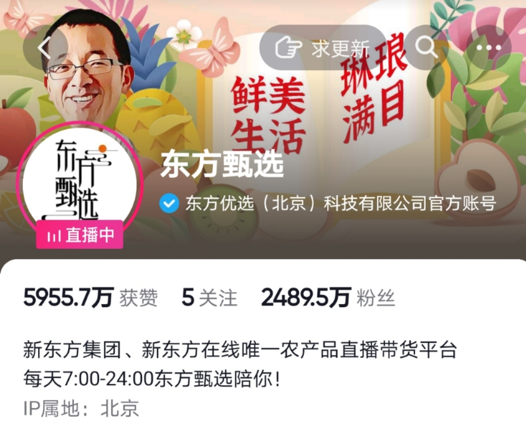 截至目前,东方甄选的抖音账号坐拥2489.5万粉丝。