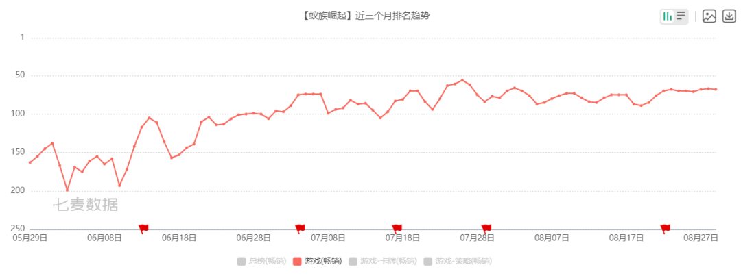 DataEye研究院认为,《蚁族崛起:神树之战》项目组进入8月加大投放力度,或许是因为三七代理发行的《小小蚁国》获得版号并计划于9月下旬公测,从而打破了蚂蚁SLG题材一家独大的局面。