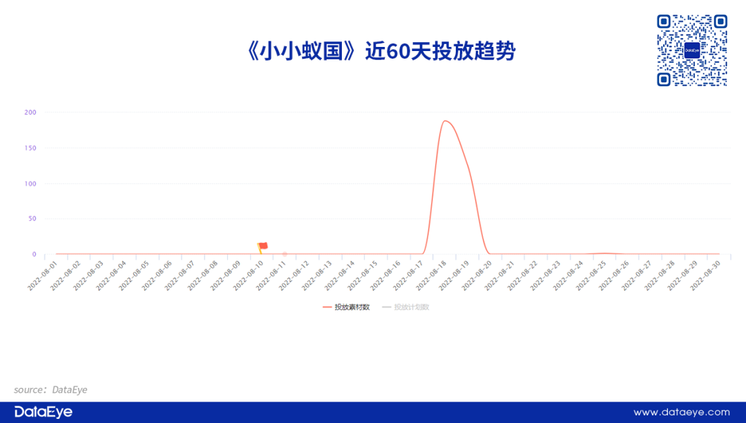 《小小蚁国》国内版宣布公测时间后,其发行团队则开始进行广告素材测试。根据DataEye-ADX数据显示,《小小蚁国》8月删档内测之后开始投放测试素材,单日投放峰值接近200组,相对强势。