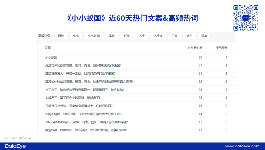 产品未上线预热阶段:主打题材特点。根据DataEye-ADX热门文案数据显示,未上线的《小小蚁国》高频热词中,包含“王国”、“地下”、“筑巢”等题材相关关键字。另外,侧重强调游戏“沉浸感”,通过对应游戏题材来吸引核心用户。