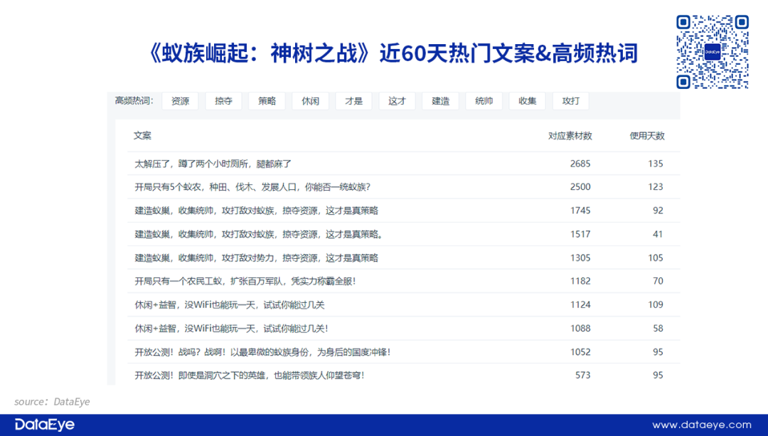 产品长线运营阶段:突出SLG游戏玩法。《蚁族崛起:神树之战》进入市场接近1年的时间,逐渐步入长线运营阶段。根据DataEye研究院数据显示,该产品近90天的高频热词主打“策略”、“资源”、“抢夺”等,希望通过品类相关词汇与国内SLG玩家形成关联,强调策略性及统帅元素,满足品类玩家的游戏需求。