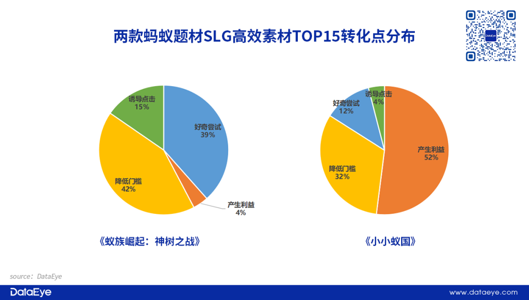 项目组将蚂蚁为主角的营销主题和素材,期望更精准的挖掘到核心用户,再通过满足大众的“猎奇”心理,在传统三国、战场这些早已让玩家审美疲劳的营销环境中,形成较为明显的差异化,以消化掉未被传统SLG转化的品类玩家。