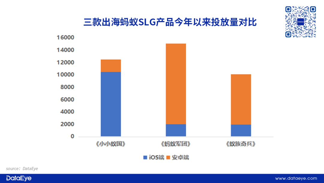 国内三款出海蚂蚁SLG在今年的海外投放市场整体表现活跃。根据DataEye-ADX海外版投放数据显示,三七互娱海外发行的《蚂蚁军团》投放素材数最多,双端合计超过1.5W组素材,排名第二的产品是首款出海蚂蚁SLG《小小蚁国》,而双端均在今年上线的《蚁族奇兵》则以合计超过1W组素材排名第三。