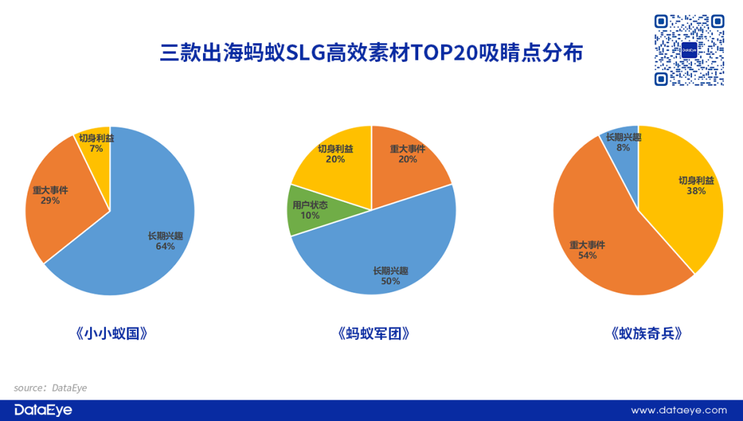 蚂蚁题材SLG在国内游戏市场属于相对小众,但项目组以题材内容作为切入点,主要突出蚂蚁相关生态、动物习性等等(长期兴趣),通过对“蚂蚁”本体的内容描写提升与题材核心用户的关联,进而对创意素材持续观看。