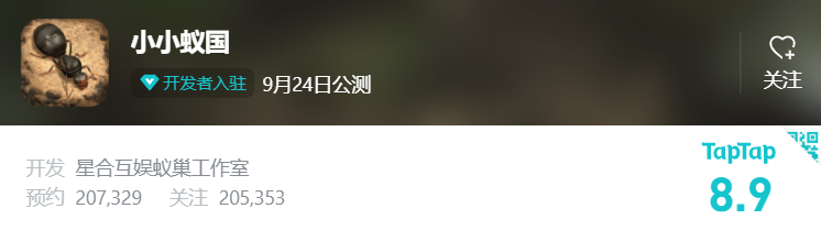 而在最新游戏版号中,星合互娱研发、三七互娱发行的《小小蚁国》赫然在列,并且近期宣布预计在9月下旬公测。目前,《小小蚁国》在TapTap评分为8.9分,用户口碑尚可,而且目前已经取得20W+的预约数,受到了不少玩家的期待。