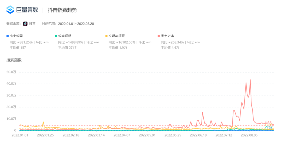 单从今年1-8月抖音的搜索均值来看,小小蚁国157、蚁族崛起2717,远低于文明与征服1.9万,率土之滨4.4万。具体数据来看,两款蚂蚁题材SLG的合计搜索均值仅为两款传统SLG产品的二十分之一。